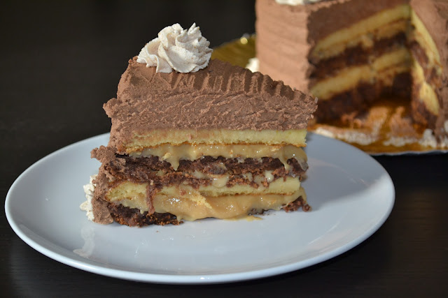 Pt. crema, facem dulce de leche din 2 conserve de lapte condensat, asa cum am procedat aici, doar ca mai adaugam si caramele.